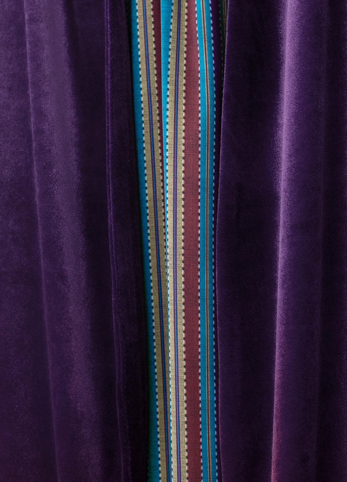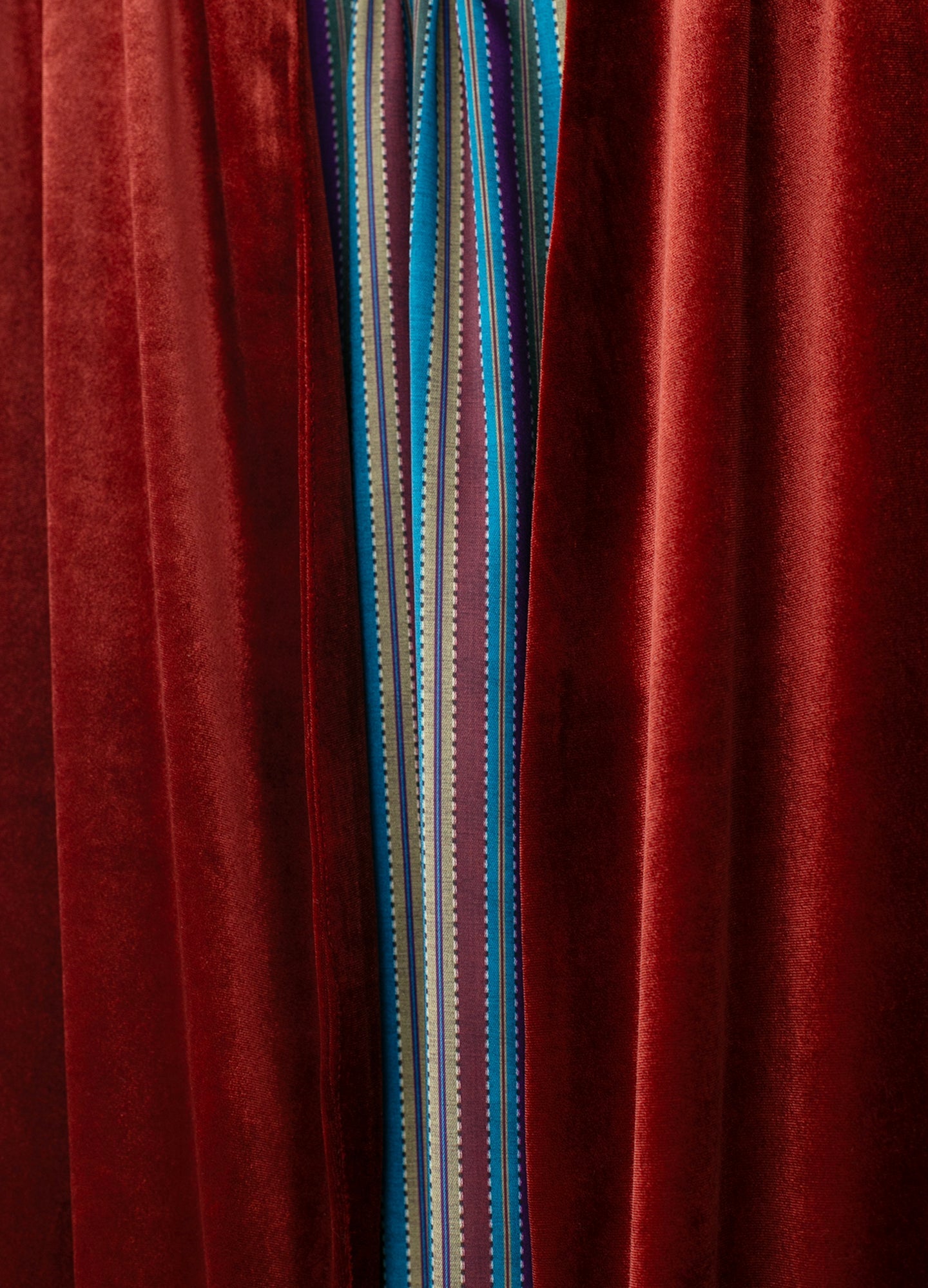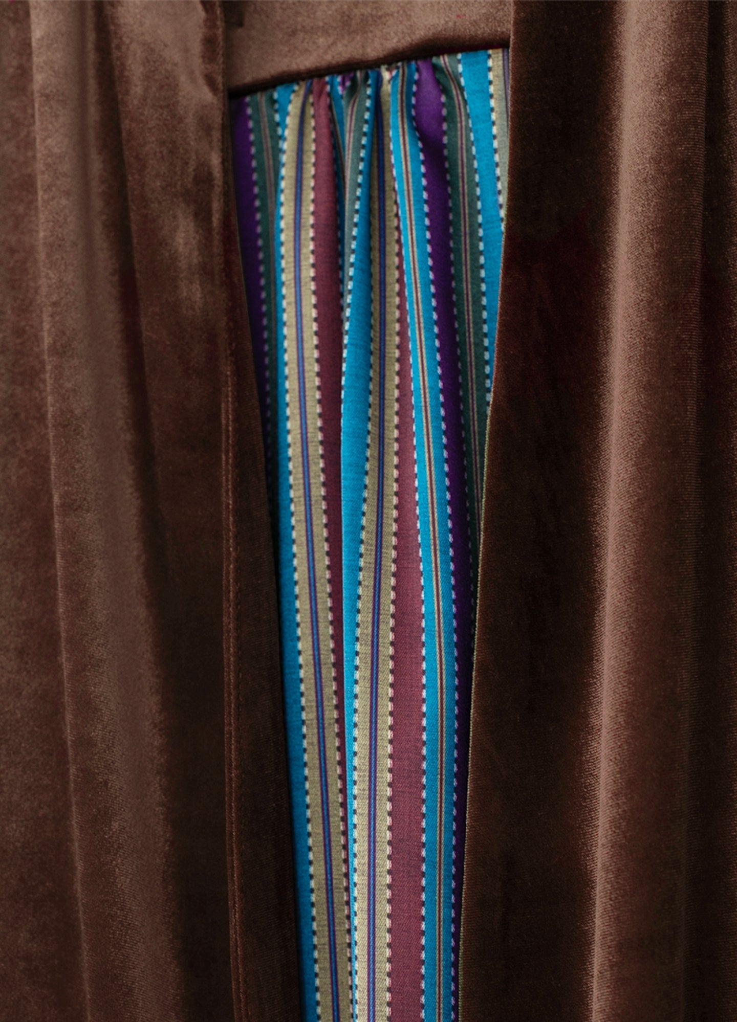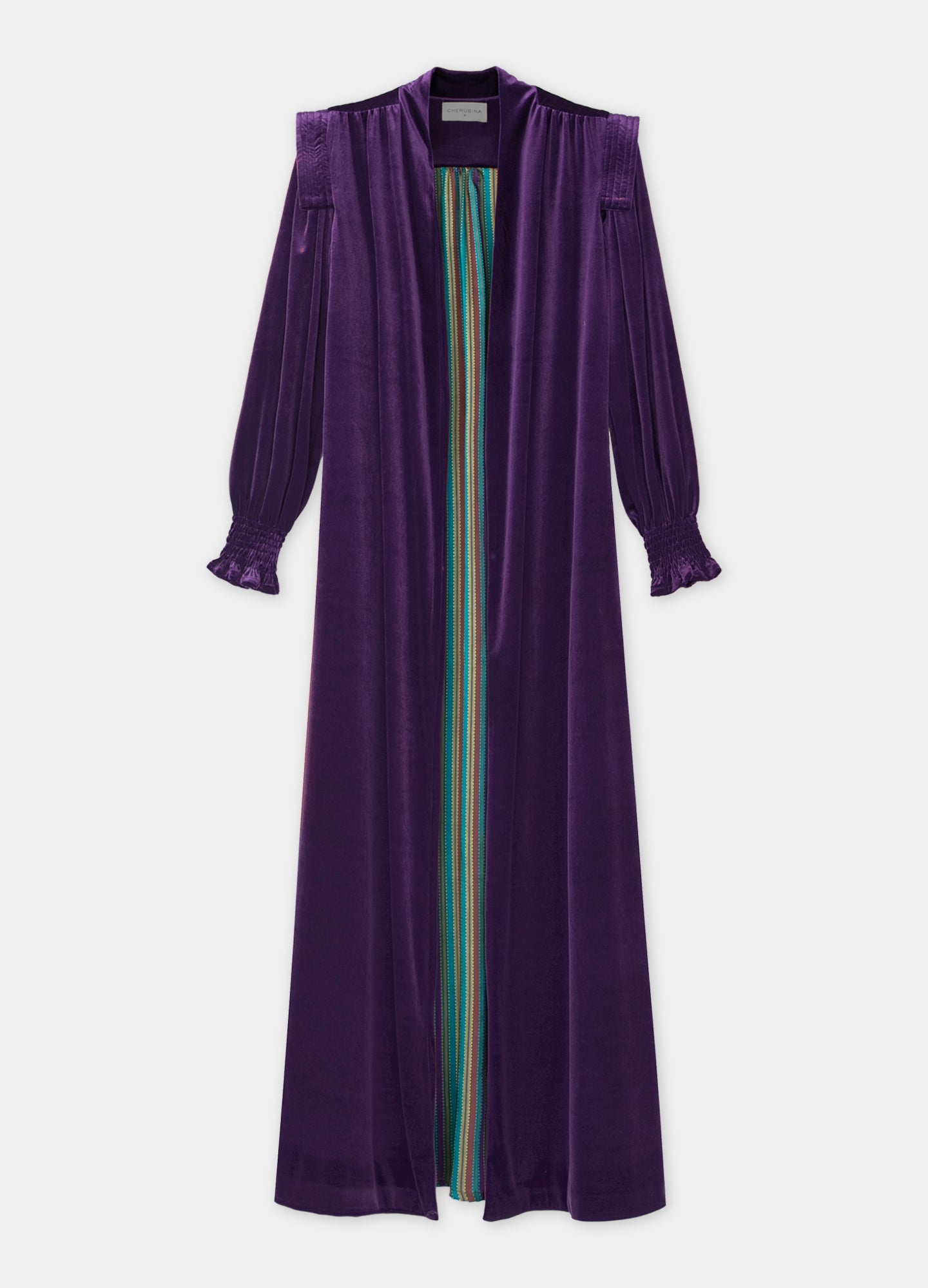 This is a long velvet coat with shoulder pads and a stitched yoke. It features puffed sleeves with gathered cuffs, which include a honeycomb elastic detail. The coat is fully lined with striped fabric.