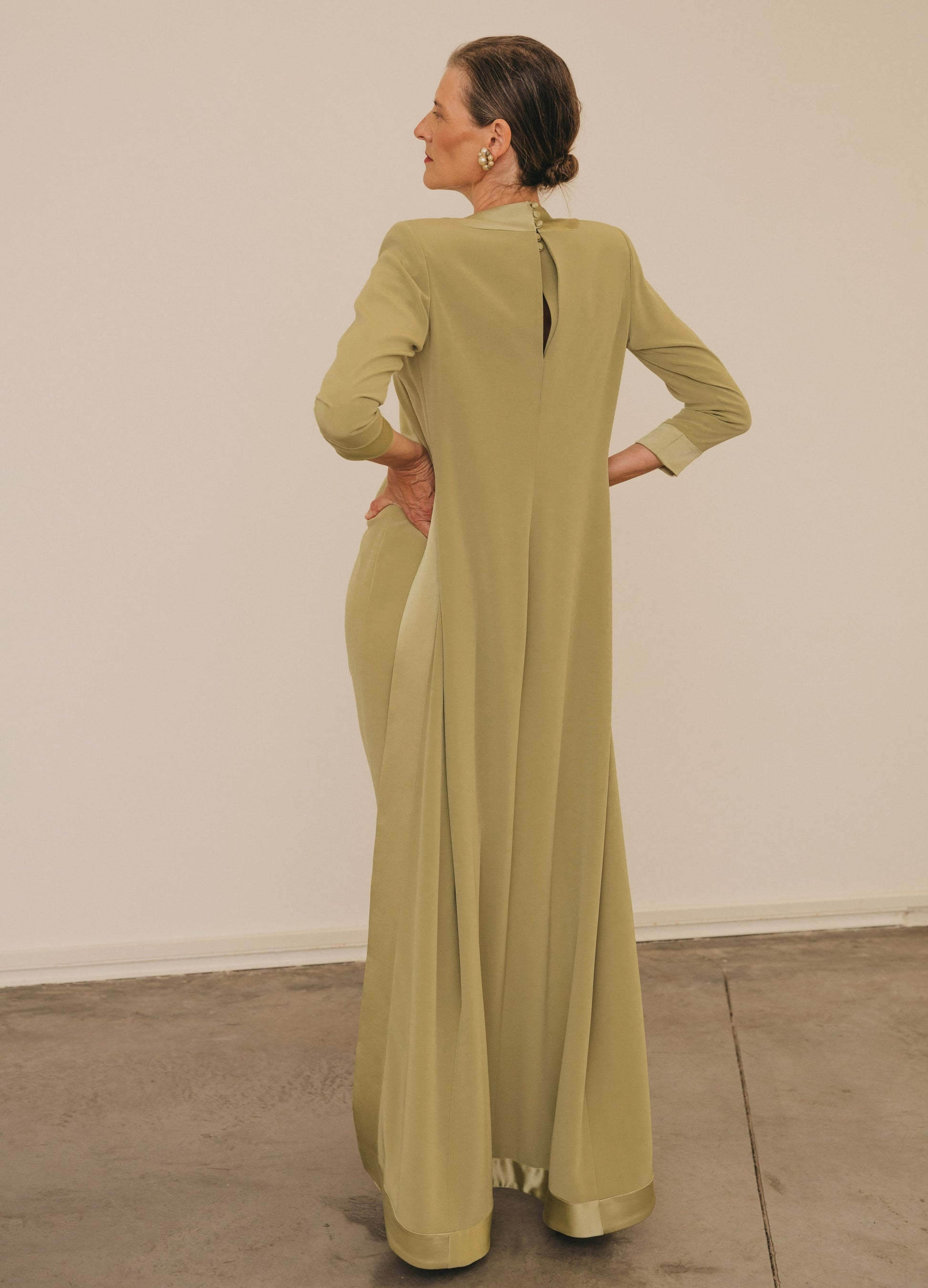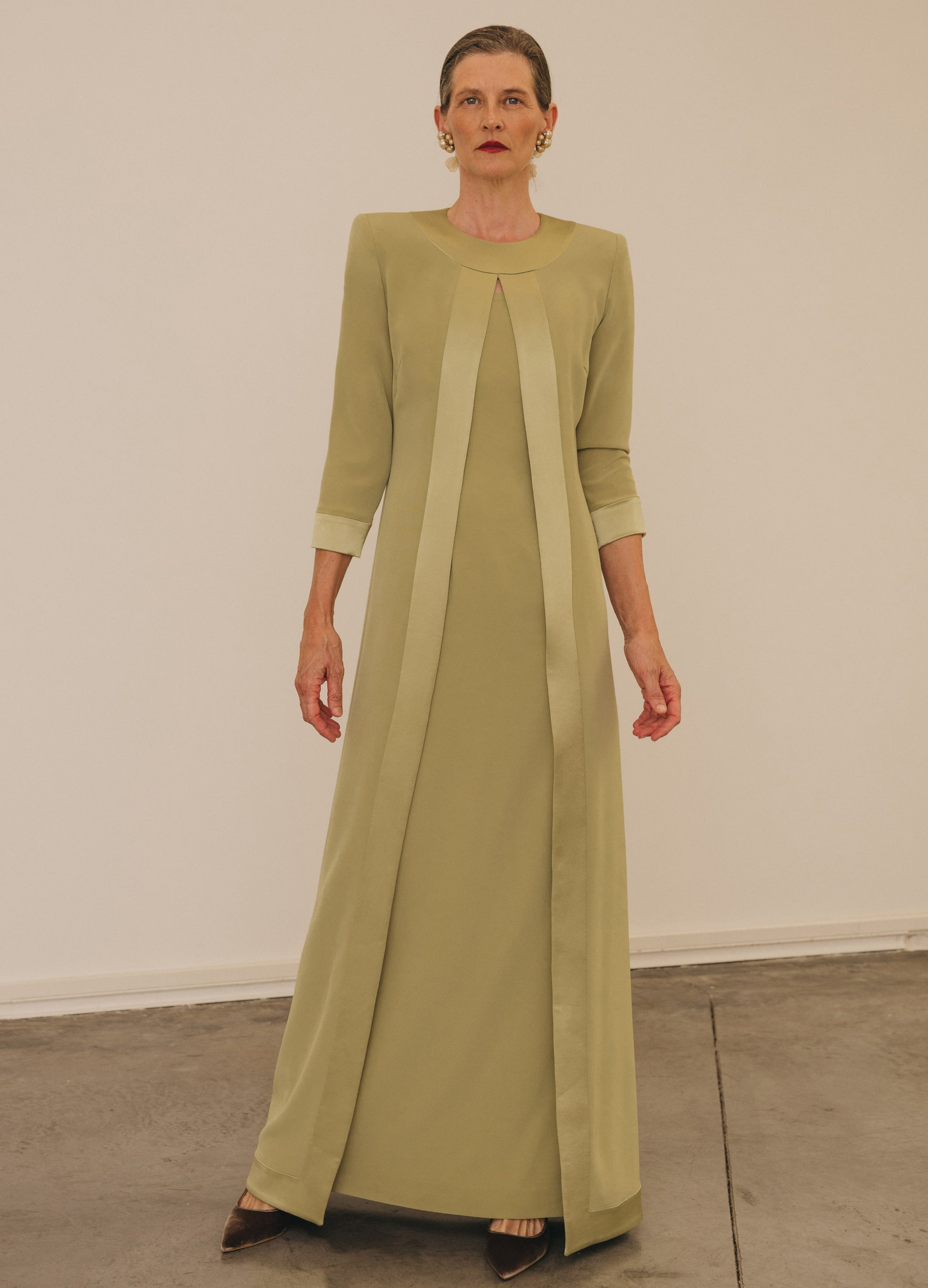 Long coat with 3/4 sleeves, crew neck. Silk crepe combining matte and satin parts.