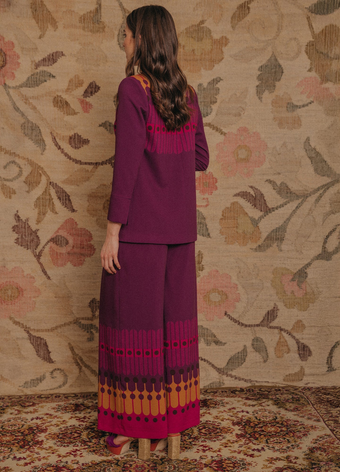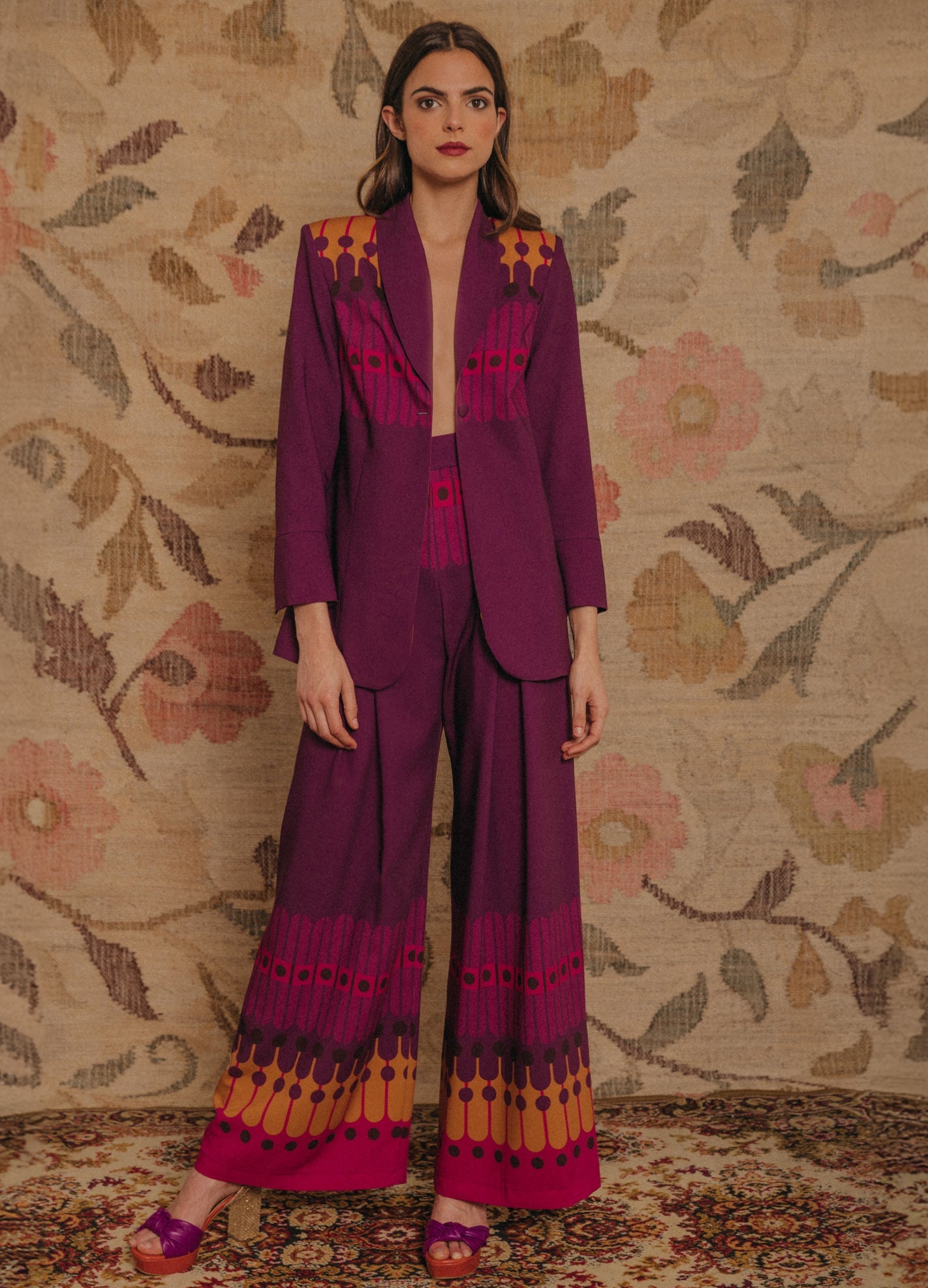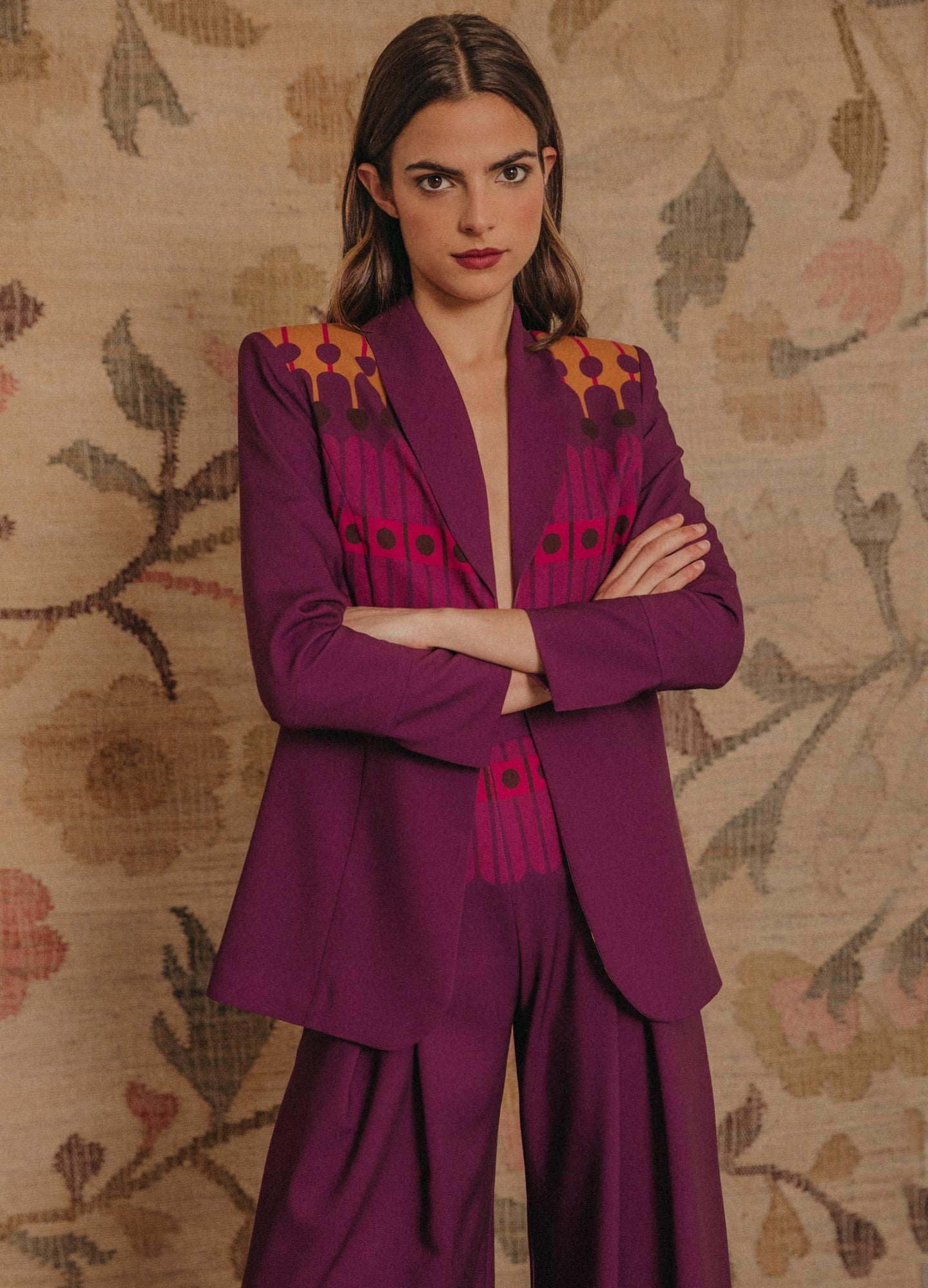 Straight cut, long-sleeved jacket with a tuxedo-style lapel, open front for an open effect. Featuring a print with a positioned geometric motif, exclusive design by Cherubina.