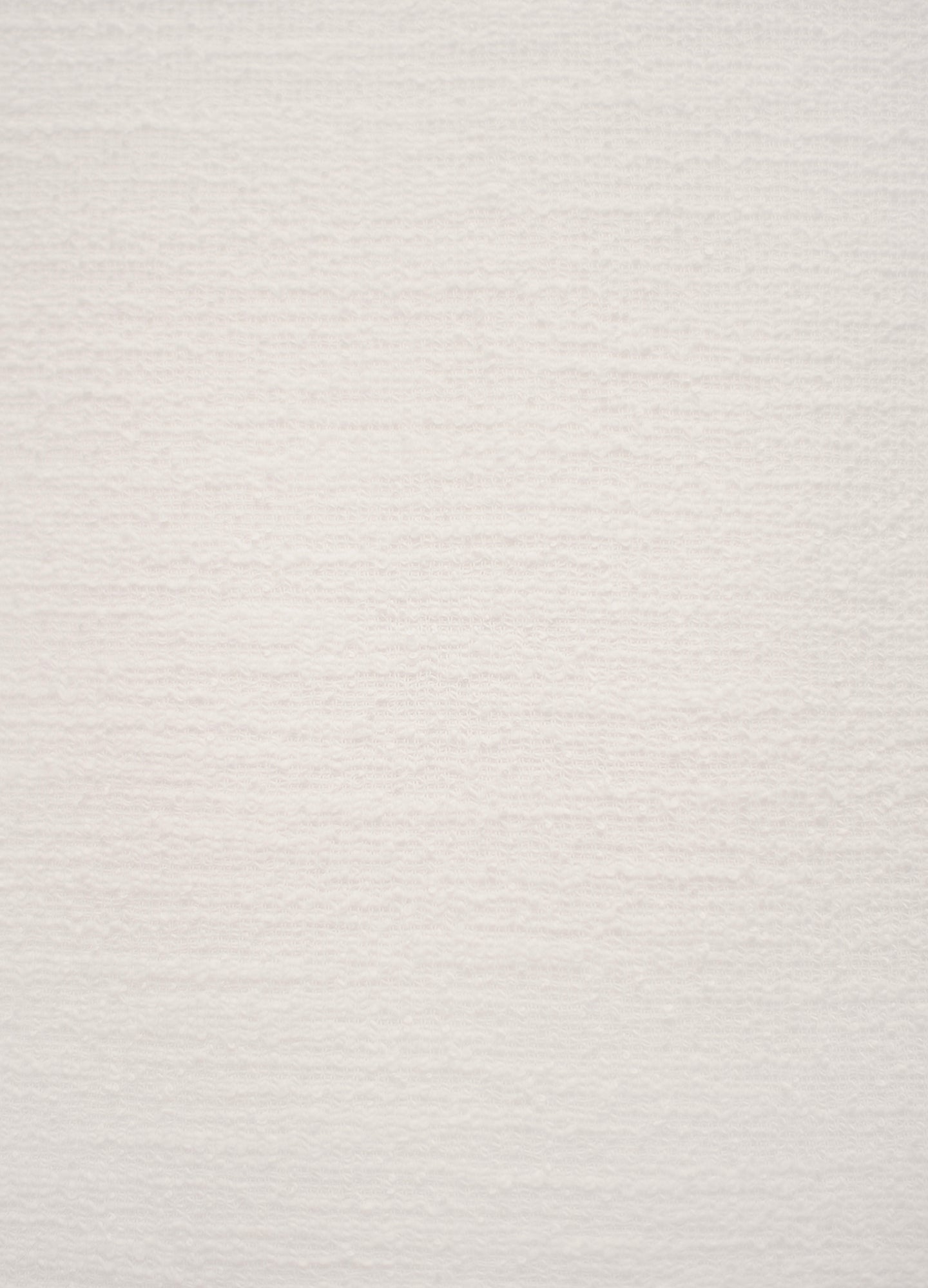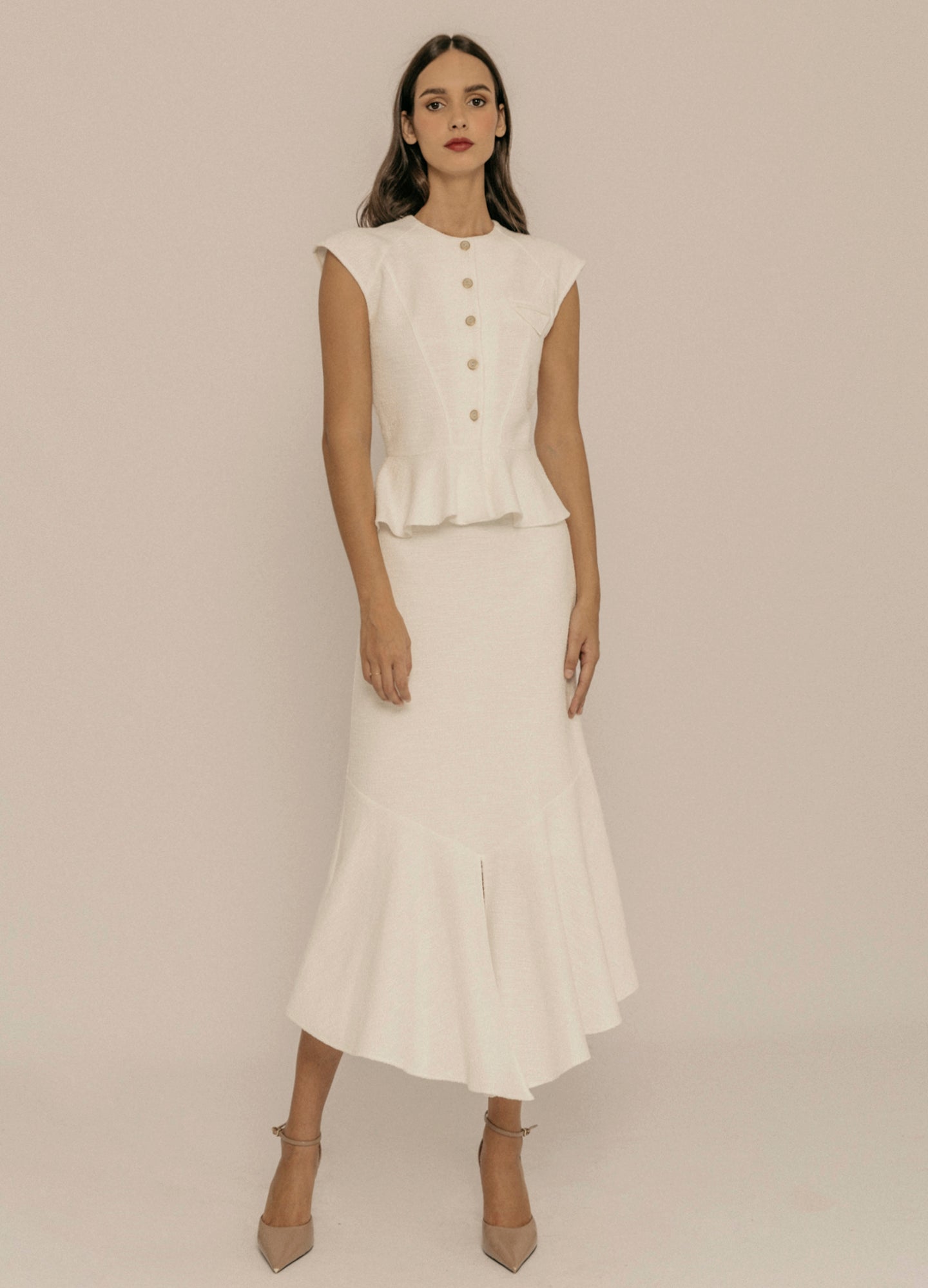 High-waisted midi skirt made from tweed fabric. Its design includes an asymmetric flared flounce with a V-shaped hem and a slit at the front. It features a waistband and an invisible zip fastening at the back.