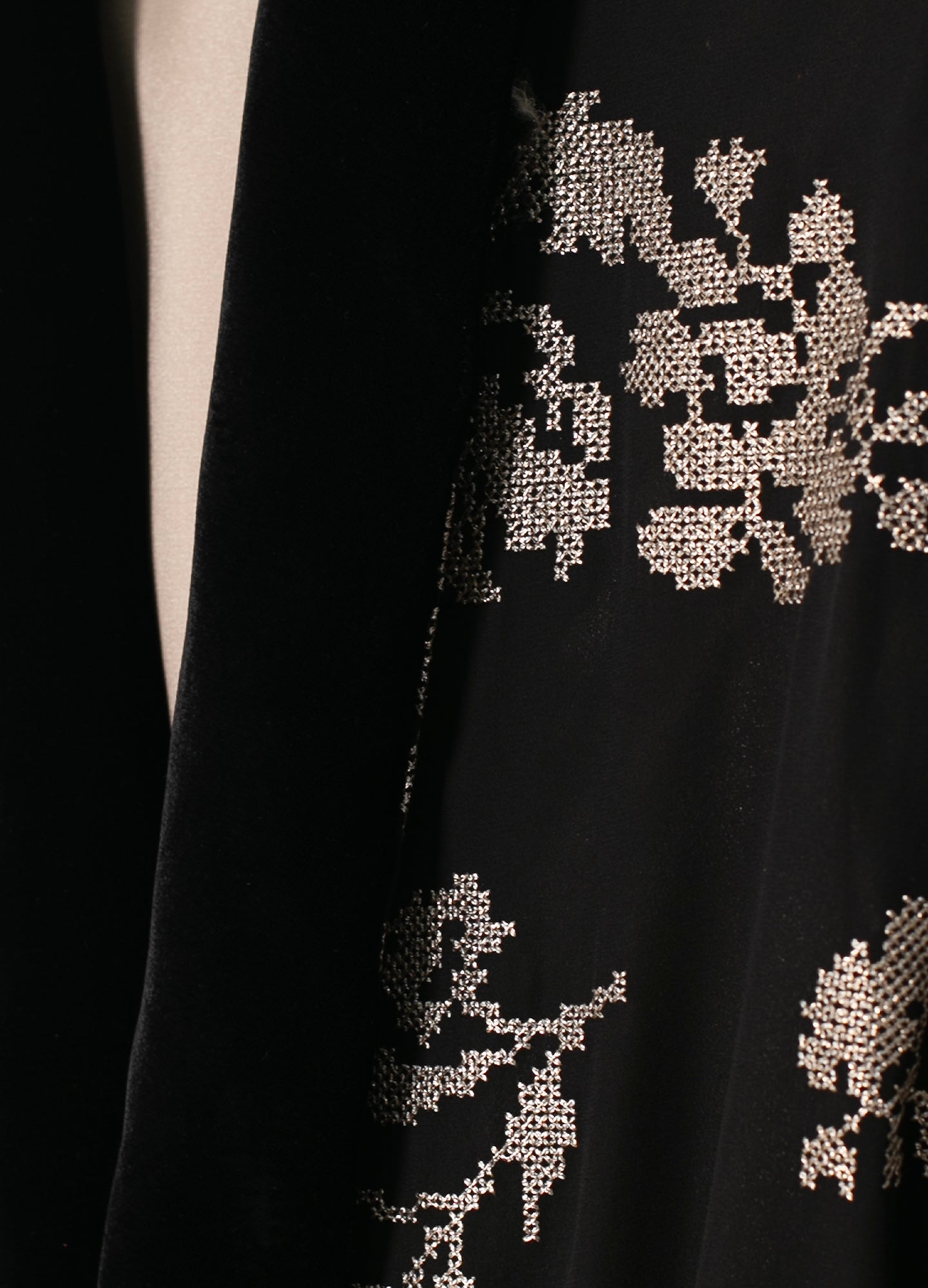 Long, straight-cut kimono made of plain fabric with floral embroidery in cross-stitch and metallic thread. Features velvet detailing on the cuffs and collar. Features belt loops and a velvet belt closure. Includes large patch pockets.