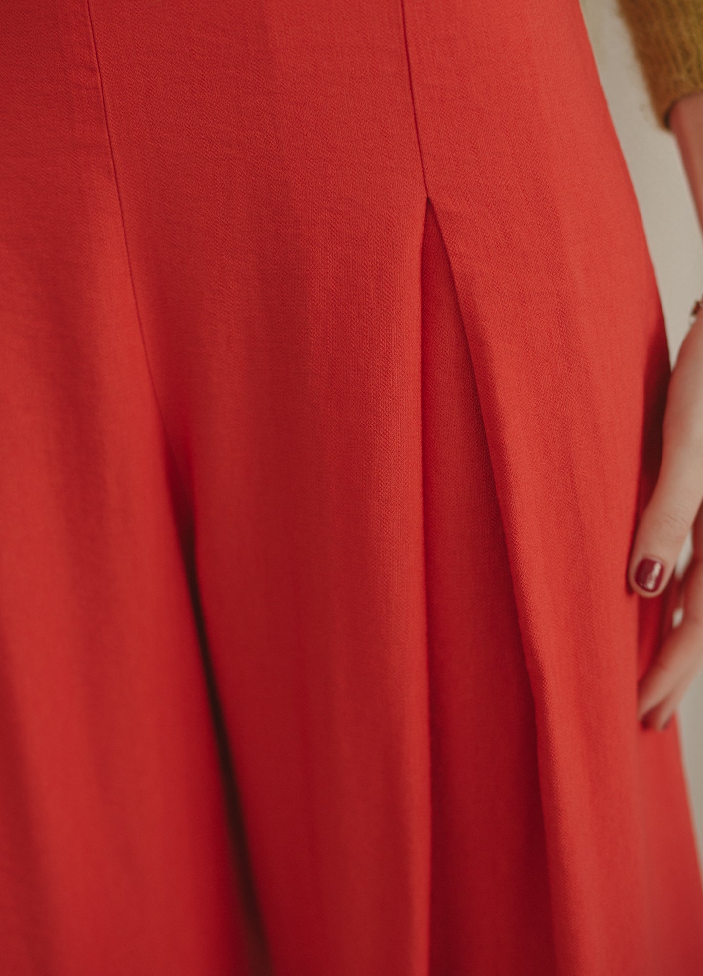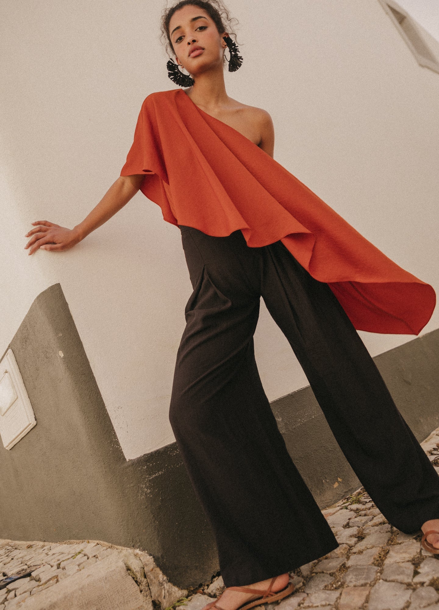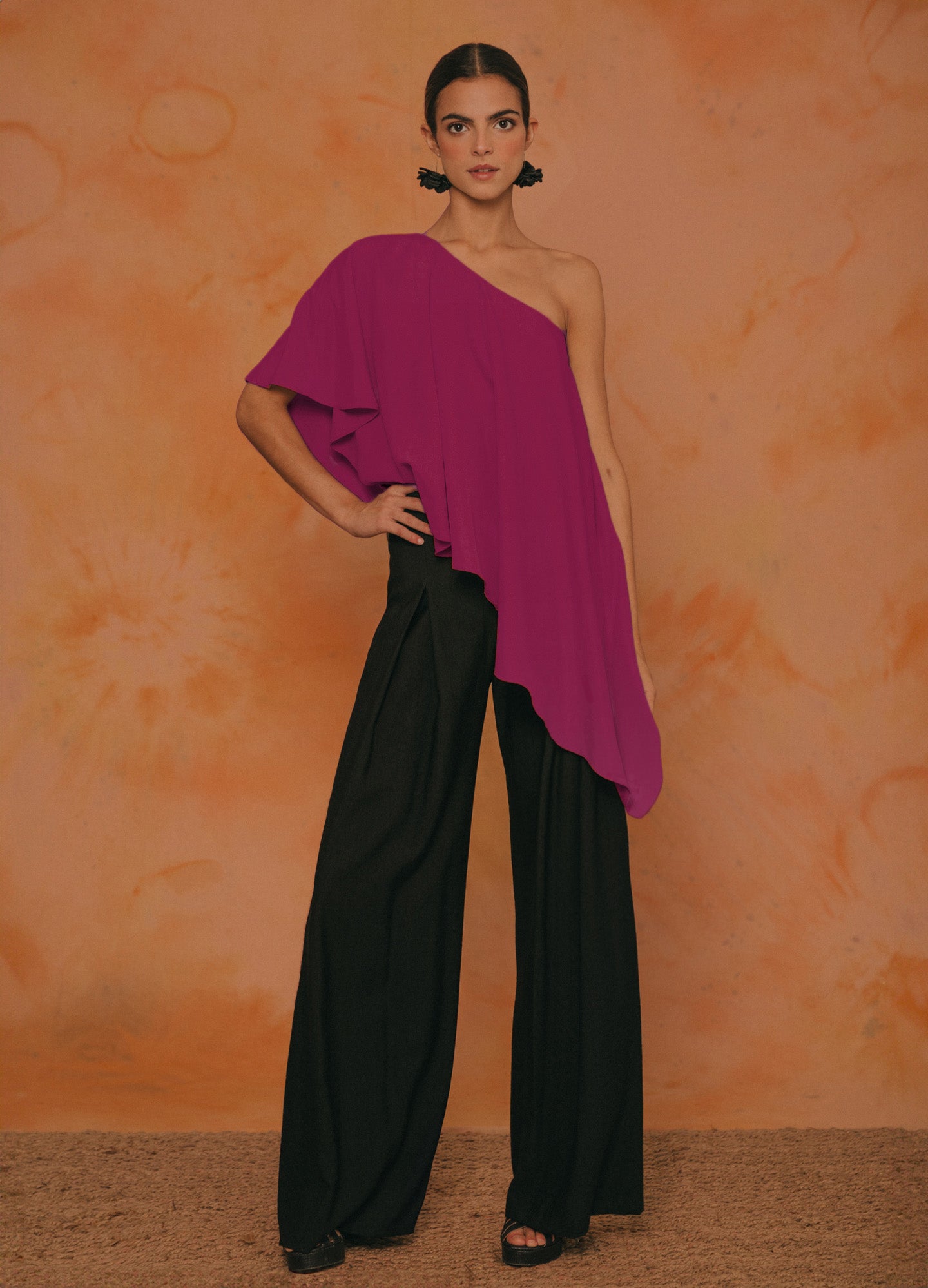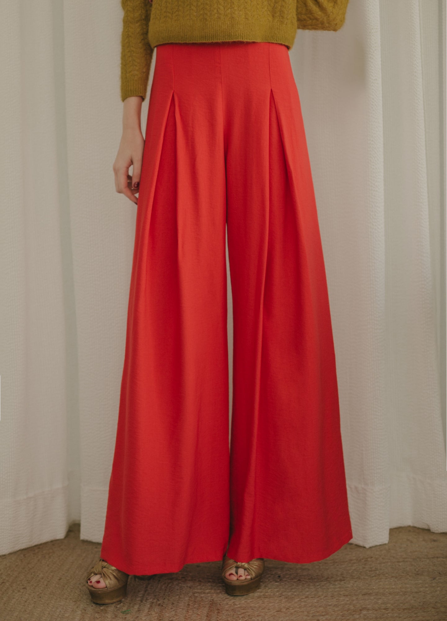 They are long fluid high-waisted pants. Wide leg with gusset that gives it greater width and flight. Closes with invisible zipper on the side.